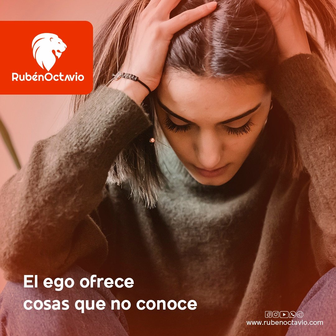 Mujer angustiada con mensaje sobre cómo el ego ofrece cosas que no conoce.